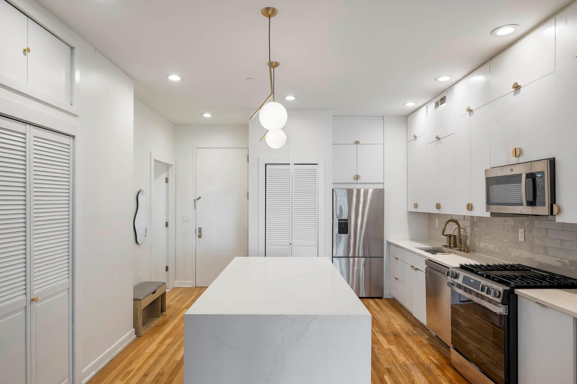 6C is an oversized 1313sf 2BR/2Bath apartment with bright southern exposure which is uniquely unobstructed due to the Dwyer Condominium's advantageous position at the intersection of Frederick Douglass Blvd and St. Nicholas Avenue. The apt's 10" ceilings make for true loft living, and the apt has also received numerous upgrades from the original sponsor's finishes. Renovated kitchen includes custom cabinetry with brass pulls, Caeserstone countertops and oversized Caeserstone island with wine fridge and additional storage. Apt features unusually ample closet space, including a full wall of augmented closets opposite the kitchen, as well as a washer/dryer.