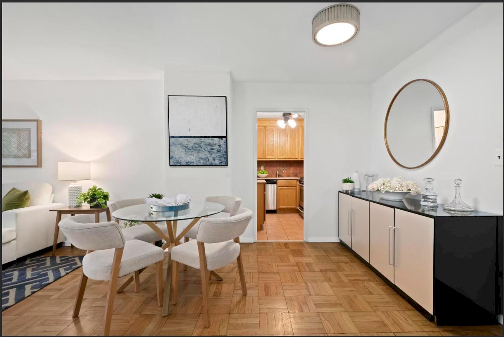 Features include beautiful refinished wood parquet floors, ample sized living room with picture windows and large dedicated dining area, north-facing view of the courtyard with open sky with a sprinkling of iconic cityscapes. The lovely kitchen offers excellent pantry space and stainless appliances Your bright primary suite features a wall of windows, plenty of space for a king size bed, plus space for a seating area or home office. The highlight: Tons of immense double size floor to ceiling closets, designer lighting, and a flex layout ready to fit all of your belongings, allowing you to create the Zen-like experience you deserve.