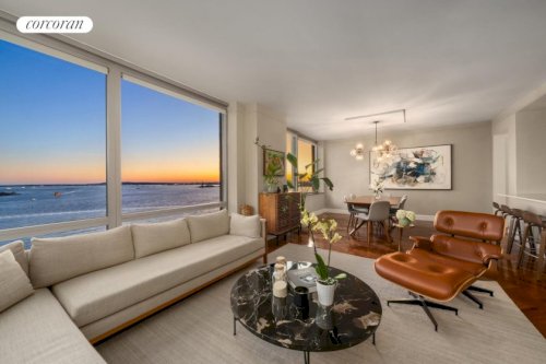 Welcome to 14C at The Visionaire! A corner unit with Hudson River views! Spread across the largest 2-bedroom floorplan in the building, this unit offers a large open-floor living area with a separate dining space and chefs kitchen featuring washed black granite counters and top of the appliances by Wolf. Upon entering, you have a foyer with a large closet and in-unit washer and dryer with beautiful hardwood floor throughout...