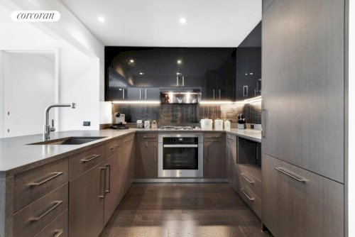 This two-bedroom, two-and-a-half-bath residence with a dedicated study features excellent East exposure and sophisticated, contemporary interiors by Shamir Shah Design. The spacious 1,549-sqft unit offers a thoughtfully designed split-bedroom layout, generous closet space including a walk-in closet, and a gourmet kitchen with a breakfast bar. The kitchen is equipped with dark stained oak cabinetry paired with dark grey...