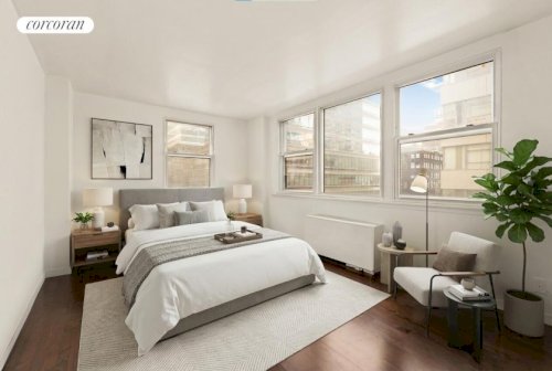Bright, spacious, and exceptionally quiet, this generously proportioned one-bedroom condominium offers comfortable living in the heart of Midtown. South-facing exposures flood the home with natural light through expansive wraparound windows, while high ceilings and newly installed hardwood floors enhance the airy, open feel throughout.\n\nA gracious entry foyer with two large closets leads into an oversized great room that...