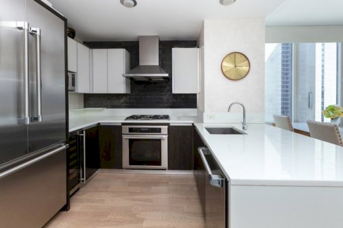 Superb, loft-like corner 2-bedroom, 2-and-1/2-bath home in the award-winning Platinum Condominium, located in the heart of the Theater District. Occupying the premium southwest corner at the Platinum, this unit features floor-to-ceiling windows that offer great light & views. The massive open kitchen boasts Thermador appliances, a Marvel wine cooler, and glass cabinets. It has 2 well-proportioned bedrooms, and the spa baths...