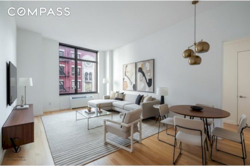 Tenant in place \n\nThis spacious 1-bedroom, 1.5-bathroom residence spans approximately 898 square feet and features 11-foot ceilings and oversized windows that bring in abundant natural light. Upon entry, a foyer leads to a walk-in closet, in-unit washer and dryer, and a conveniently located half bathroom.\n\nThe open layout includes a kitchen equipped with a Sub-Zero refrigerator, Miele dishwasher, and Wolf range. The open...