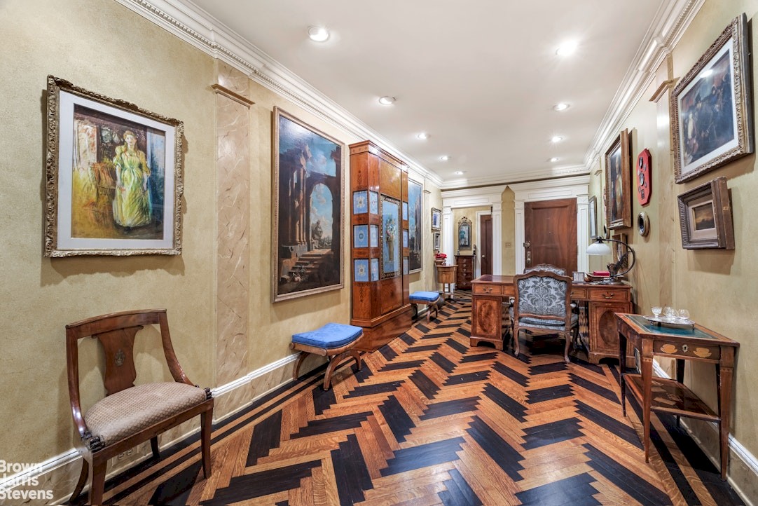 Upon entering through a semi-private landing, a gracious 27-foot-long central gallery sets a tone of quiet luxury, framed by decorative wainscoting and classic herringbone wood floors that seamlessly connects to a spacious, South-facing living room featuring a wood-burning fireplace with custom millwork and built-in bookshelves. French doors open to the formal