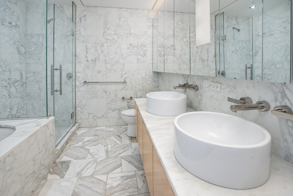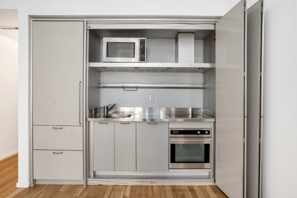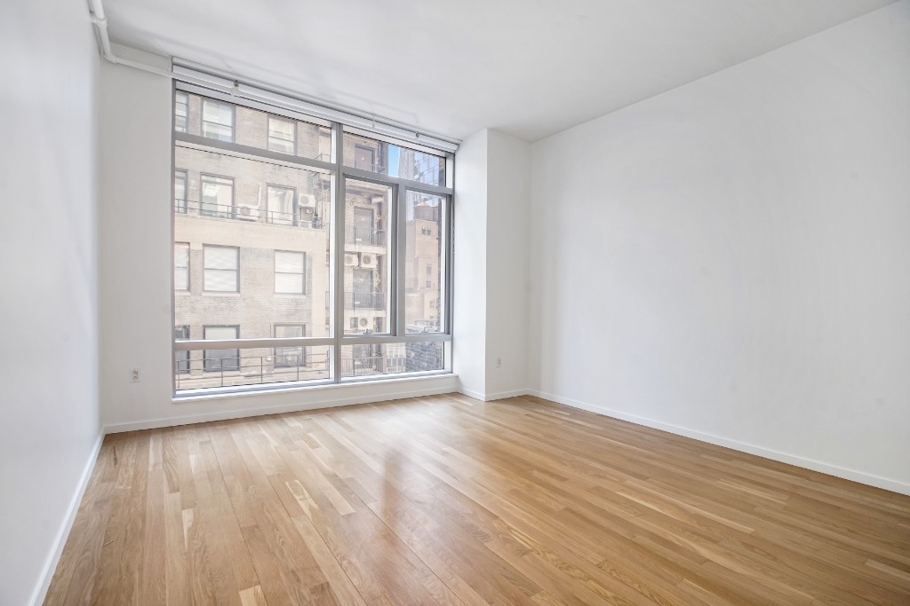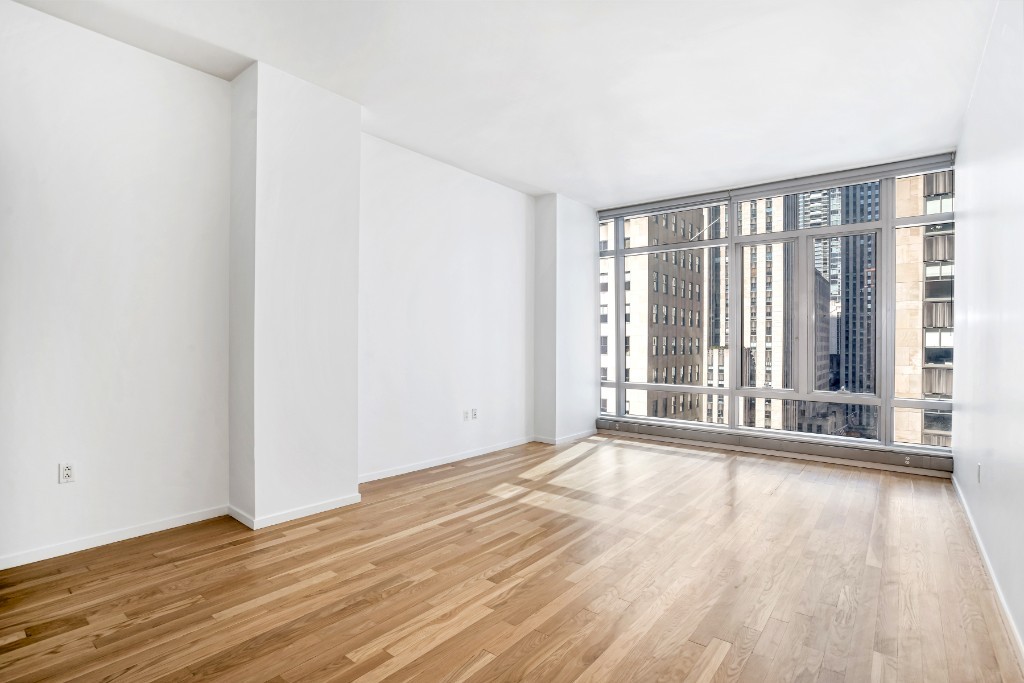 Direct views of Rockefeller Plaza provide the spectacular backdrop to this apartment at the Centria, located in the Midtown West neighborhood. Its a sunny, loft-like apartment which boasts stunning, floor to ceiling windows, a state of the art folding Driade designed kitchen, with stainless steel appliances, granite slab counters and custom glass cabinetry. Both bathrooms have limestone flooring, Calacatta marble walls and counters with beautiful Waterworks hardware. The luxurious en suite master bath has a double vanity, oversized soaking tub and separate thermostatic shower, and the half bath also neatly tucks away brand new the Bosch washer and dryer. Living room and bedroom pictures are virtually staged.