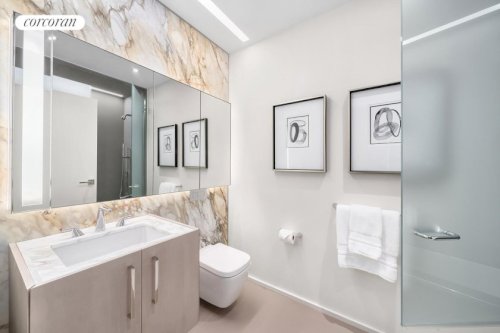 Light fills this expansive residence through floor-to-ceiling windows and glass doors that open seamlessly to the private terrace. The chef's kitchen is a study in elegance, appointed with Gaggenau appliances, polished quartz countertops, and acid-etched, back-painted glass cabinetry with custom millwork interiors. The en-suite primary bath is a true retreat, featuring Calacatta Paonazzo marble across the vanity, tub deck...